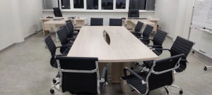 В составе кабинета присутствует модульная линейка переговорных столов, состоящих из прямых и угловых секций на опорах из ЛДСтП