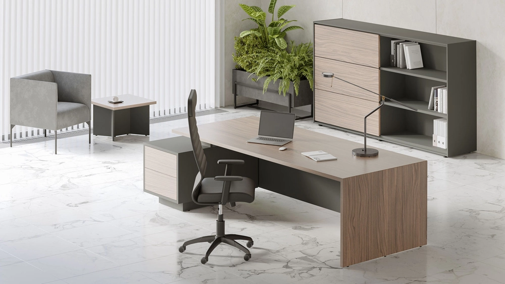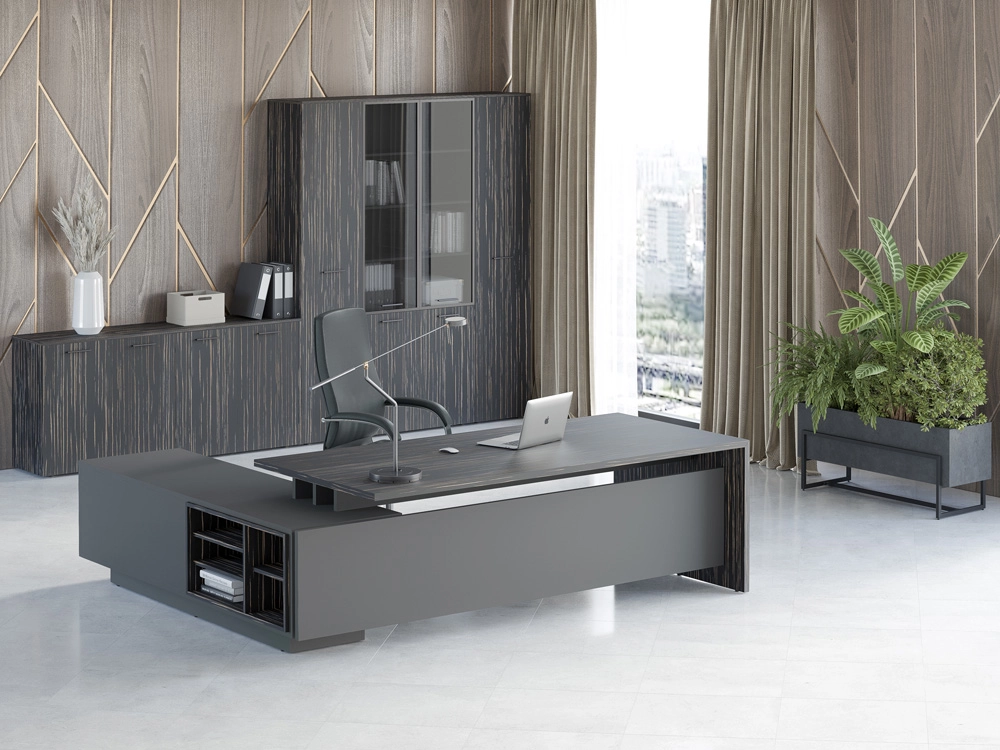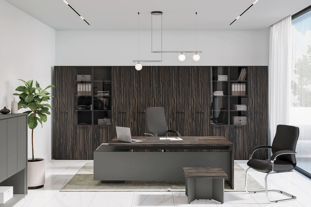 Антрацитовые каркасы в сочетании с фасадами и столешницами из шпона премиального эбенового дерева формируют утончённый и одновременно минималистичный образ рабочего пространства. Такой дизайн подчёркивает статус своего владельца и его приверженность актуальным интерьерным трендам.