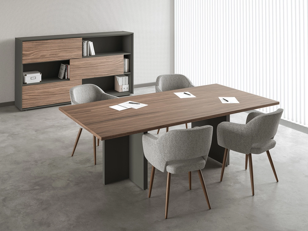 Линейка включает два варианта размеров столов — 200 и 230 см, каждый из которых может комплектоваться как большой, так и малой опорной тумбой. Модульные шкафные конструкции можно компоновать с антрацитовыми каркасами. При этом есть возможность дополнительно декорировать их боковыми и верхними панелями из шпона.