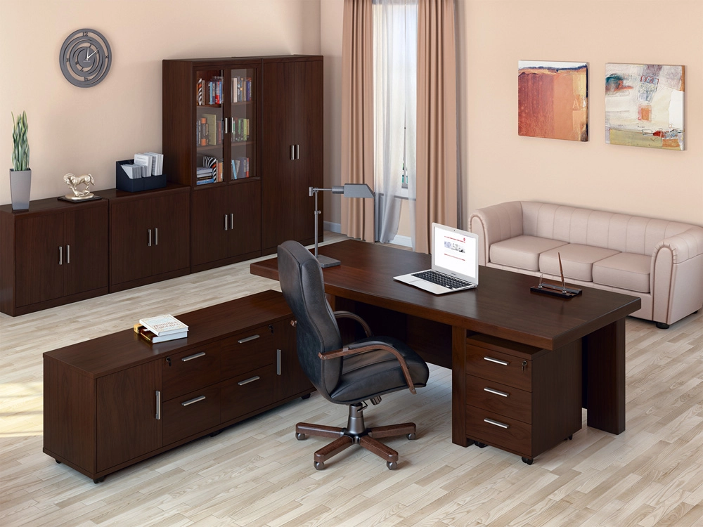 Модульная система включает все базовые элементы для обустройства рабочего пространства. Вы можете создать собственный идеальный кабинет, подобрав необходимые предметы, или выбрать готовое решение, разработанное профессионалами.