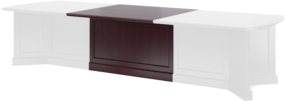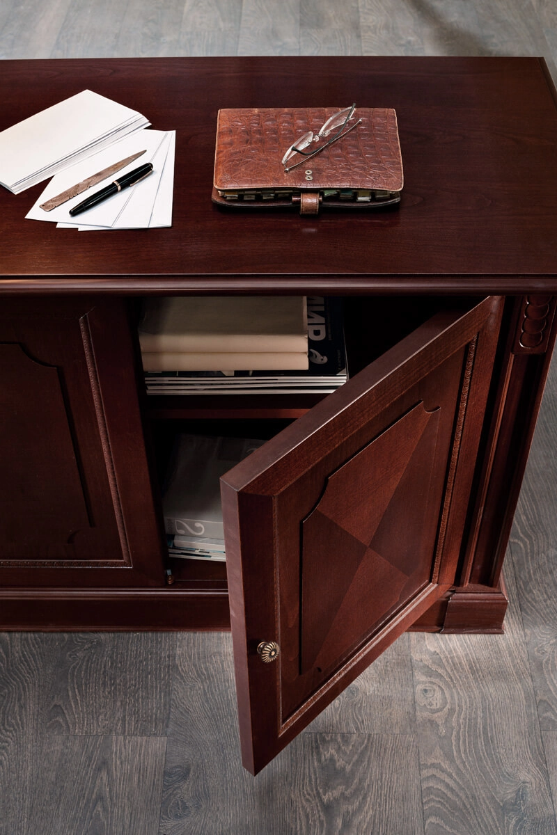 Теплая текстура натурального дерева создает в офисе благоустроенность, а глубокий цвет ореха Танганьика и рельефная резьба делают интерьер похожим на кабинеты с богатой историей.
