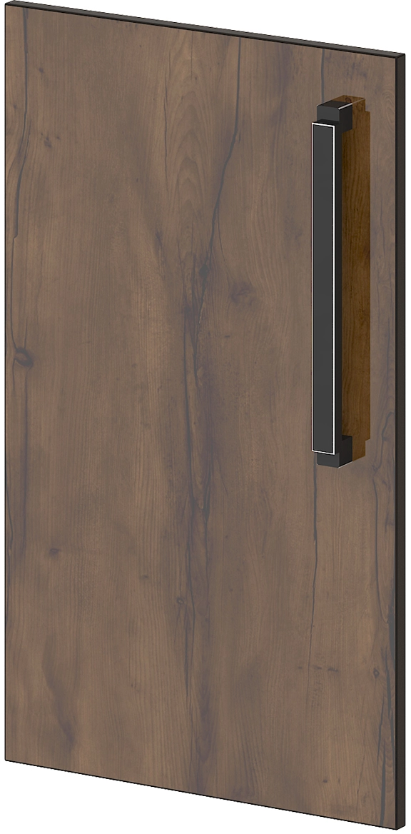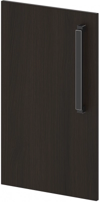 Двери изготавливаются из ЛДСП 18 мм, торцы облицованы кромкой ABS толщиной 2 мм, цвет Дуб Линдберг темный. Ручка-скоба металлическая, межцентровое расстояние 320 мм, цвет – черный глянец со шлифованными гранями. Дверь – накладная с вертикальной осью вращения, крепится с помощью 4-х шарнирных петель с углом открывания 110 градусов, с механизмом плавного закрывания.