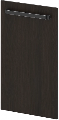 Двери изготавливаются из ЛДСП 18 мм, торцы облицованы кромкой ABS толщиной 2 мм, цвет Дуб Линдберг темный. Ручка-скоба металлическая, межцентровое расстояние 320 мм, цвет – черный глянец со шлифованными гранями. Дверь – накладная с вертикальной осью вращения, крепится с помощью 4-х шарнирных петель с углом открывания 110 градусов, с механизмом плавного закрывания.