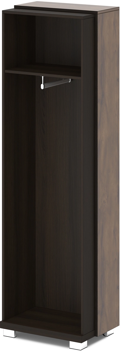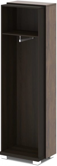 Размеры: 614х440мм х2049. Низ каркаса шкафа изготавливается из ЛДСП 43 мм, торцы облицованы кромкой ABS толщиной 2 мм в цвет плиты. Бока, задняя стенка и внутреннее наполнение каркаса шкафа изготавливаются из ЛДСП 18 мм, торцы облицованы кромкой ABS толщиной 2 мм в цвет плиты. На каркас шкафа крепятся топ и 2 дополнительных бока из ЛДСП 18 мм с лаковым покрытием. Боковые торцы топа облицованы кромкой ABS толщиной 1 мм в цвет плиты, остальные торцы облицованы кромкой ABS толщиной 2 мм, цвет «Дуб Линдберг темный». Каркас шкафа имеет верхнюю полку под головные уборы и отделение с поперечной вешалкой-штангой, прикрепленной к горизонтали. Каркас шкафа установлен на 4-х регулируемых опорах размером 80х80х48. Опоры 5-угольной формы, черные пластиковые, с металлической накладкой по периметру, покрытие «Хром блестящий».