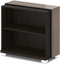 Размеры: 932x440x857. Низ стеллажа изготавливается из ЛДСП 43 мм, торцы облицованы кромкой ABS толщиной 2 мм в цвет плиты. Каркас и задняя стенка стеллажа изготавливаются из ЛДСП 18 мм, торцы облицованы кромкой ABS толщиной 2 мм в цвет плиты. На каркас стеллажа крепятся топ и 2 дополнительных бока из ЛДСП 18 мм с лаковым покрытием. Боковые торцы топа облицованы кромкой ABS толщиной 1 мм в цвет плиты, остальные торцы облицованы кромкой ABS толщиной 2 мм, цвет «Дуб Линдберг темный». Стеллаж имеет 1 горизонталь из ЛДСП 18 мм, торец облицован кромкой ABS толщиной 2 мм в цвет плиты. Стеллаж установлен на 4-х регулируемых опорах размером 80х80х48. Опоры 5-угольной формы, черные пластиковые, с металлической накладкой по периметру, покрытие «Хром блестящий».