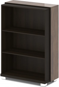 Размеры: 932х440х1305. Низ стеллажа изготавливается из ЛДСП 43 мм, торцы облицованы кромкой ABS толщиной 2 мм в цвет плиты. Каркас и задняя стенка стеллажа изготавливаются из ЛДСП 18 мм, торцы облицованы кромкой ABS толщиной 2 мм в цвет плиты. На каркас стеллажа крепятся топ и 2 дополнительных бока из ЛДСП 18 мм с лаковым покрытием. Боковые торцы топа облицованы кромкой ABS толщиной 1 мм в цвет плиты, остальные торцы облицованы кромкой ABS толщиной 2 мм, цвет «Дуб Линдберг темный». Стеллаж имеет 2 горизонтали из ЛДСП 18 мм, торцы облицованы кромкой ABS толщиной 2 мм в цвет плиты. Стеллаж установлен на 4-х регулируемых опорах размером 80х80х48. Опоры 5-угольной формы, черные пластиковые, с металлической накладкой по периметру, покрытие «Хром блестящий».