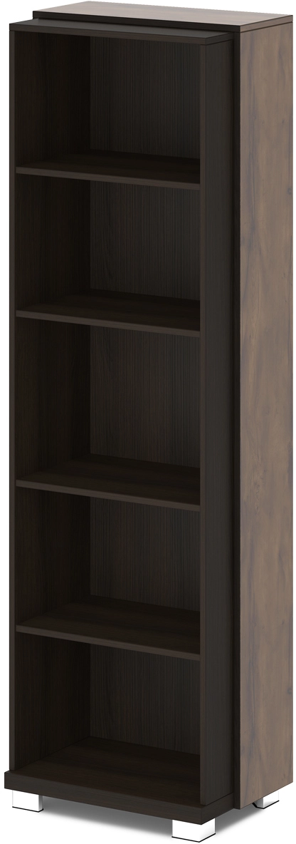 Размеры: 632х440х2049. Низ стеллажа изготавливается из ЛДСП 43 мм, торцы облицованы кромкой ABS толщиной 2 мм в цвет плиты. Каркас и задняя стенка стеллажа изготавливаются из ЛДСП 18 мм, торцы облицованы кромкой ABS толщиной 2 мм в цвет плиты. На каркас стеллажа крепятся топ и 2 дополнительных бока из ЛДСП 18 мм с лаковым покрытием. Боковые торцы топа облицованы кромкой ABS толщиной 1 мм в цвет плиты, остальные торцы облицованы кромкой ABS толщиной 2 мм, цвет «Дуб Линдберг темный». Стеллаж имеет 4 горизонтали из ЛДСП 18 мм, торцы облицованы кромкой ABS толщиной 2 мм в цвет плиты. Стеллаж установлен на 4-х регулируемых опорах размером 80х80х48. Опоры 5-угольной формы, черные пластиковые, с металлической накладкой по периметру, покрытие «Хром блестящий».