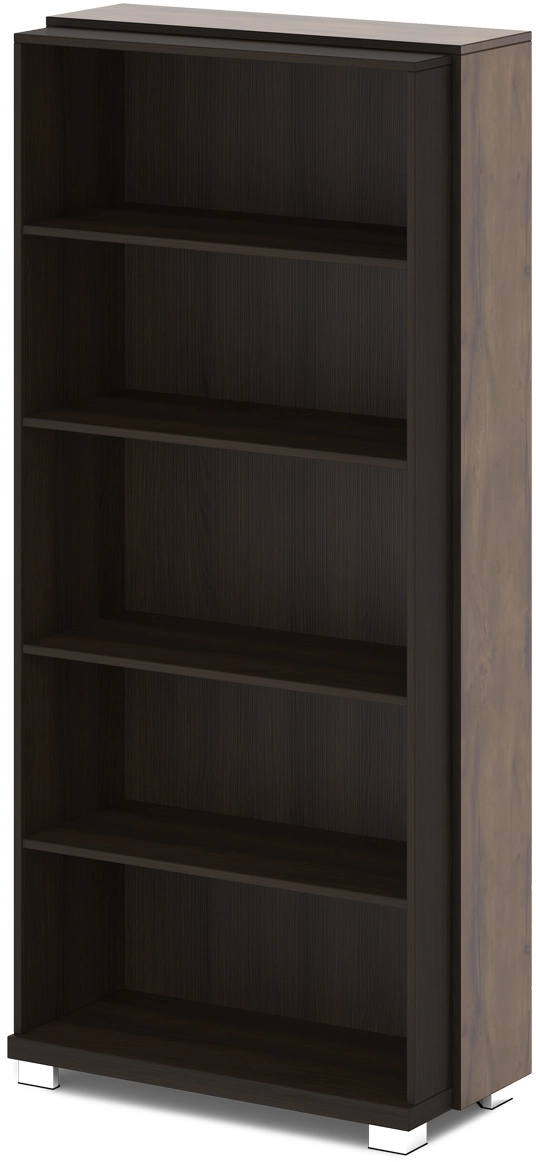 Размеры: 932х440х2049. Низ стеллажа изготавливается из ЛДСП 43 мм, торцы облицованы кромкой ABS толщиной 2 мм в цвет плиты. Каркас и задняя стенка стеллажа изготавливаются из ЛДСП 18 мм, торцы облицованы кромкой ABS толщиной 2 мм в цвет плиты. На каркас стеллажа крепятся топ и 2 дополнительных бока из ЛДСП 18 мм с лаковым покрытием. Боковые торцы топа облицованы кромкой ABS толщиной 1 мм в цвет плиты, остальные торцы облицованы кромкой ABS толщиной 2 мм, цвет «Дуб Линдберг темный». Стеллаж имеет 4 горизонтали из ЛДСП 18 мм, торцы облицованы кромкой ABS толщиной 2 мм в цвет плиты. Стеллаж установлен на 4-х регулируемых опорах размером 80х80х48. Опоры 5-угольной формы, черные пластиковые, с металлической накладкой по периметру, покрытие «Хром блестящий».