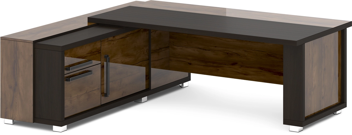 Стол руководителя с греденцией. Греденция имеет 3 ящика (2 внешних и 1 внутренний) на шариковых направляющих скрытого монтажа полного выдвижения, обладающих плавным ходом и оборудованных доводчиками. Оснащена отсеком с переставной полкой или местом под сейф с дверью-купе. Размер отсека - 600х490х554. Стол состоит из сборной опоры и тумбы-греденции, служащей опорой, столешницы и соединительного щита. Стол левый – тумба-греденция с левой стороны, сборная опора – с правой стороны. Стол правый – тумба-греденция с правой стороны, сборная опора – с левой стороны. На рис. - правый.