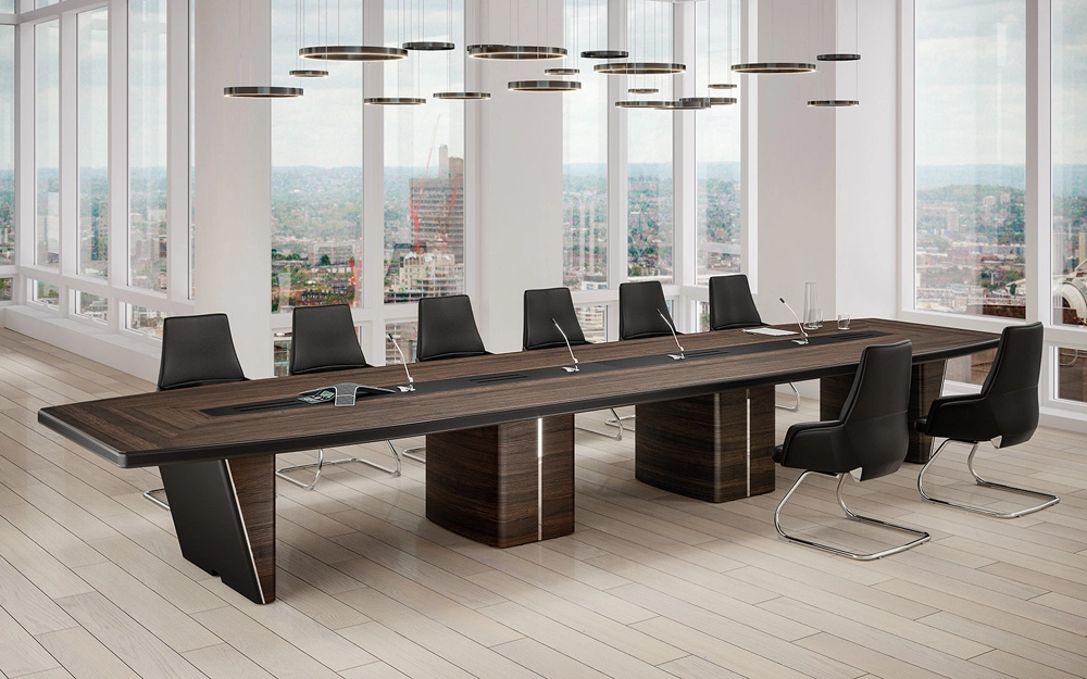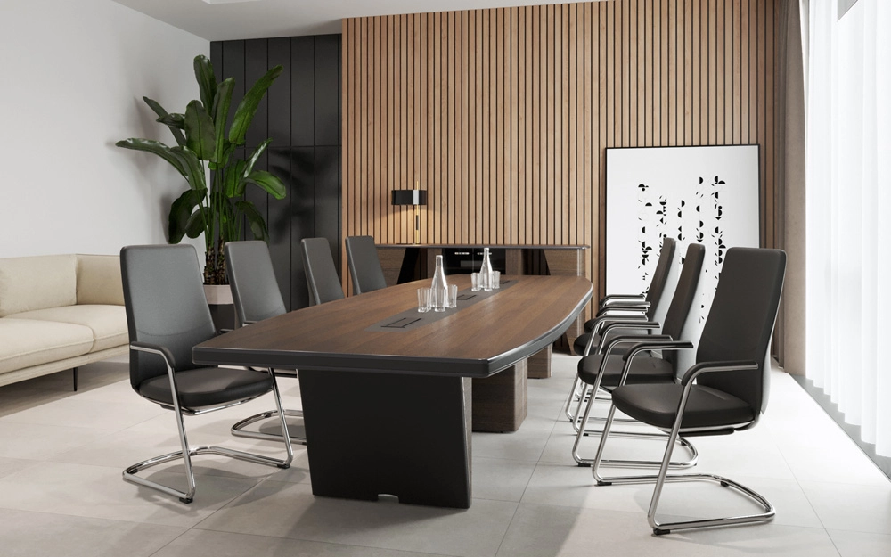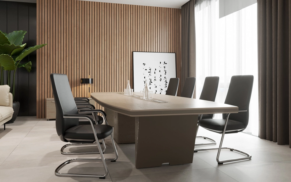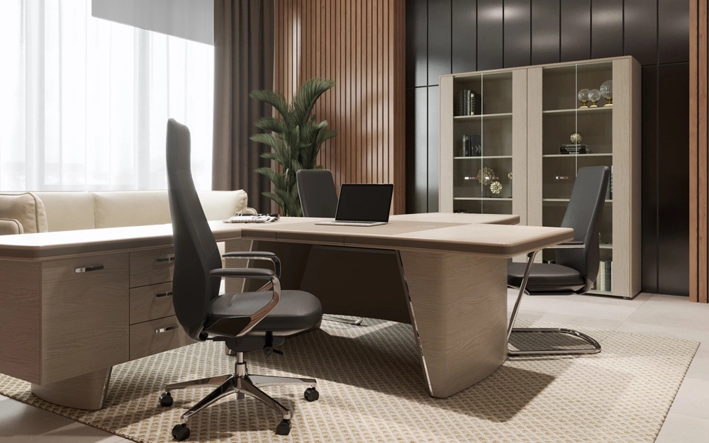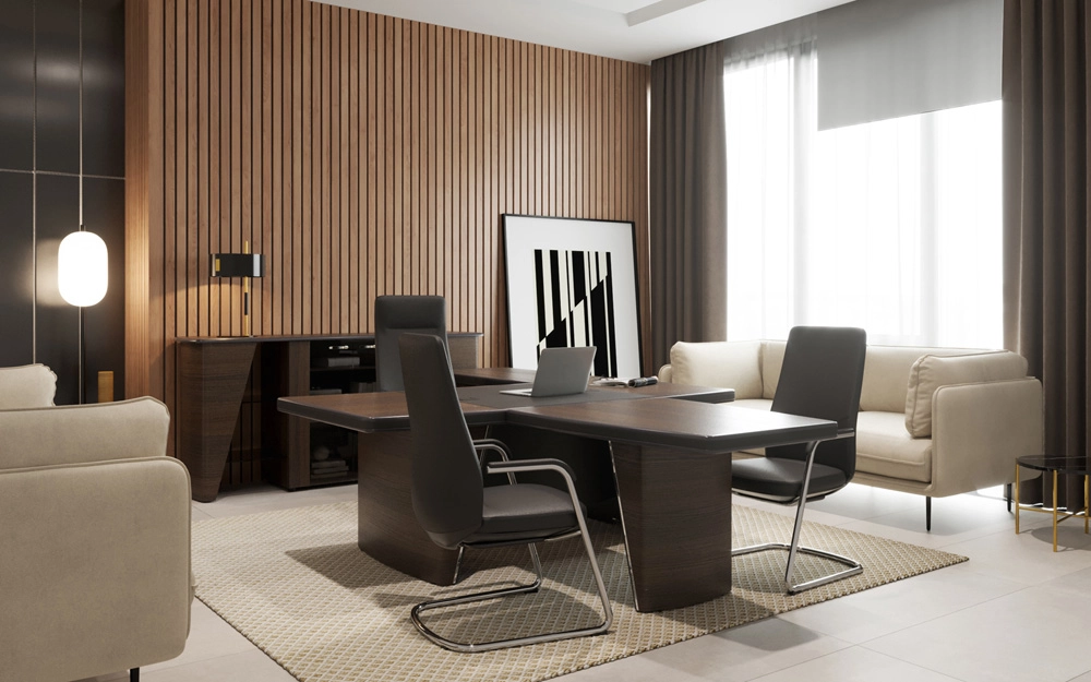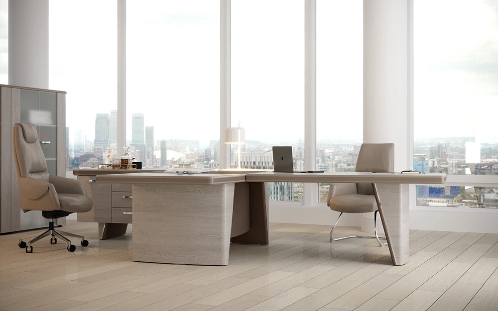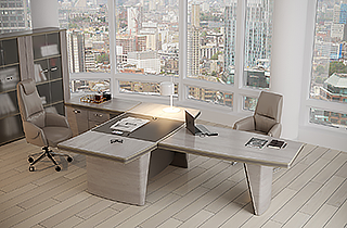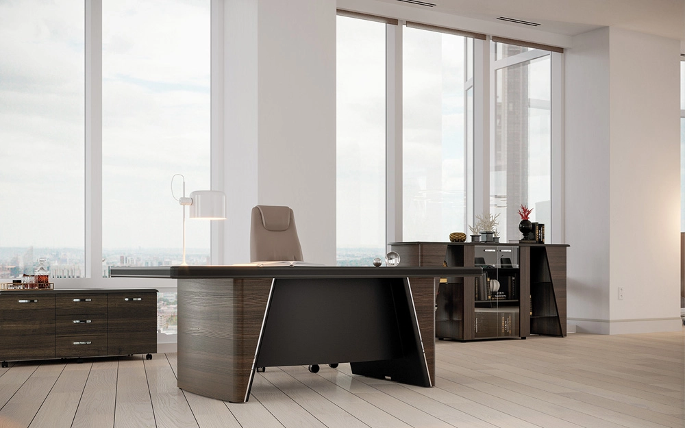 Кабинет руководителя New.Tone за эффектным внешним видом скрывает технологичные решения: беспроводную зарядную станцию под бюваром из экокожи, внутренние кабель-каналы, механизмы плавного закрывания. Сочетание удобства и эстетики — главная черта коллекции.