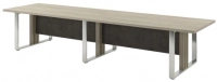 Стол переговоров на 10 человек. Столешница и планки выполнены из ЛДСП 38 мм, кромка ABS 2 мм. На коротких торцах столешницы кромка поперечная, на остальных элементах продольная. Опора из профильной трубы из нержавеющей стали сечением 80*20. Соединительный щит - ЛДСП 18 мм, цвет Бетон Чикаго, кромка ABS 2 мм.
