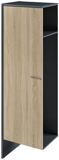 Дополнительная секция шкафа для одежды. Оснащен одной верхней полкой и поперечной вешалкой-штангой. Каркас изготавливается в цвете "Антрацит". Каркас стеллажа облицован противоударной кромкой ПВХ 2 мм и кромкой ПВХ 0,4 мм. Задняя стенка - ЛДСП 8 мм. Дверь в цвете "Дуб Сонома" - ЛДСП 18 мм. Каркас стеллажа быстро и надежно собирается на эксцентриковых стяжках и шкантах, что позволяет многократную сборку-разборку мебели. Эксцентрики закрываются пластиковыми заглушками в цвет плиты. Фурнитура полок дает возможность установки и демонтажа без разбора корпуса. Опоры регулируемые, диаметр 25 мм, высота 8 мм, диапазон регулировки - до 10 мм. Материал - пластик черный. Стеллаж может быть произведен в левом и правом исполнении, в зависимости от направления открывания высокой двери. Стеллажи могут состоять в секционной конструкции шкафной группы, которая позволяет собирать шкафы в единую цельную цепочку с неограниченным количеством секций. Еще одна особенность – наличие отдельного подкатного ящика, который может устанавливаться под нижней полкой шкафов (арт. I-026).