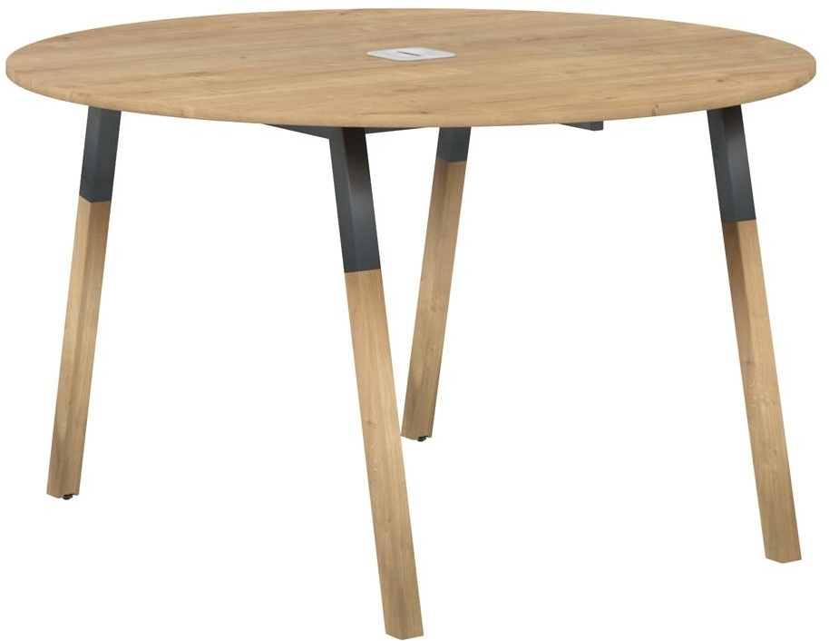 Столешница круглая из ЛДСП т.18мм. c кромкой ABS т.2.мм, комплектуется квадратной заглушкой кабель-канала в центре, 2-мя траверсами и комбинированными опорами А-образной формы, верхняя часть из трубы 40х40мм и нижняя часть материал – массив бука; отделка – масло-воск. Опоры с регулировкой внизу.