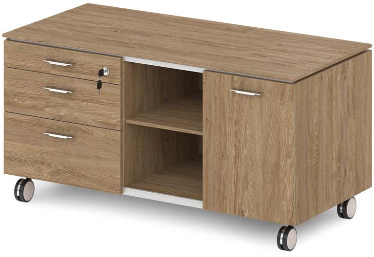 Особенности Офисная тумба подкатная "Греденция" с метабоксами, замком на 1 ящик, нишей и дверью-купе. На фото - левая тумба. Артикул: G-210 л/пр. Размеры: 1200х590х605. Каркас греденции, фасады и дверь-купе выполнены из ЛДСП 18 мм, облицованы кромкой ABS толщиной 2 мм в цвет плиты. Топ греденции приподнят над каркасом на 9 мм, изготовлен из ЛДСП 12 мм, облицован кромкой ABS 2 мм в цвет плиты. Греденция имеет 3 выдвижных ящика с метабоксами, нишу и секцию с дверью-купе. Каждый ящик оснащен доводчиком. Дно ящиков - из ЛДСП толщиной 12 мм. В фасад первого ящика устанавливается замок со складным ключом. Задняя стенка греденции имеет 2 металлические заглушки кабель-канала прямоугольной формы с прямоугольным отверстием под провода. Размер заглушки 160х50х25 мм, покрытие «Хром блестящий». В греденции применяется однодорожечный механизм купе с нижним ходовым элементом. Греденция имеет 4-х колесных опоры диаметром 80 мм, со стопором, покрытие – «Хром блестящий», цвет ободка колеса – черный, цвет боковой поверхности колеса - серый. Ручка-скоба металлическая плоская, межосевое расстояние 64 мм, размером 116х22х8 мм, покрытие «Хром блестящий». Греденция собирается на эксцентриковых стяжках и шкантах, что позволяет многократную сборку-разборку мебели. В эксцентрики вставляются пластиковые заглушки в цвет плиты. Для бесшумного закрывания ящиков применяются фетровые отбойники серого цвета. В греденции возможны комбинации древоподобного цвета с цветом «Бежевый песок». Офисная тумба подкатная "Греденция" с метабоксами, замком на 1 ящик, нишей и дверью-купе. На фото - левая тумба. Артикул: G-210 л/пр. Размеры: 1200х590х605. Каркас греденции, фасады и дверь-купе выполнены из ЛДСП 18 мм, облицованы кромкой ABS толщиной 2 мм в цвет плиты. Топ греденции приподнят над каркасом на 9 мм, изготовлен из ЛДСП 12 мм, облицован кромкой ABS 2 мм в цвет плиты. Греденция имеет 3 выдвижных ящика с метабоксами, нишу и секцию с дверью-купе. Каждый ящик оснащен доводчиком. Дно ящиков - из ЛДСП толщиной 12 мм. В фасад первого ящика устанавливается замок со складным ключом. Задняя стенка греденции имеет 2 металлические заглушки кабель-канала прямоугольной формы с прямоугольным отверстием под провода. Размер заглушки 160х50х25 мм, покрытие «Хром блестящий». В греденции применяется однодорожечный механизм купе с нижним ходовым элементом. Греденция имеет 4-х колесных опоры диаметром 80 мм, со стопором, покрытие – «Хром блестящий», цвет ободка колеса – черный, цвет боковой поверхности колеса - серый. Ручка-скоба металлическая плоская, межосевое расстояние 64 мм, размером 116х22х8 мм, покрытие «Хром блестящий». Греденция собирается на эксцентриковых стяжках и шкантах, что позволяет многократную сборку-разборку мебели. В эксцентрики вставляются пластиковые заглушки в цвет плиты. Для бесшумного закрывания ящиков применяются фетровые отбойники серого цвета. В греденции возможны комбинации древоподобного цвета с цветом «Бежевый песок».
