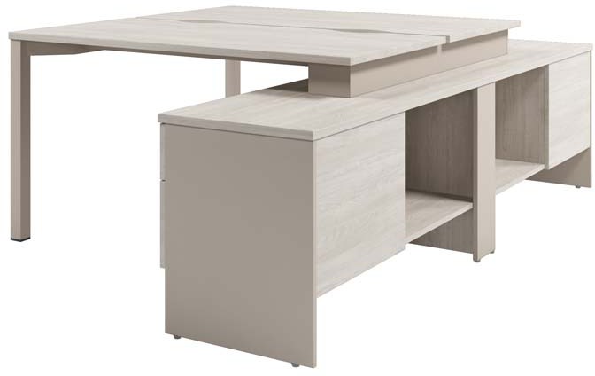 Столешница, крышка тумбы - ЛДСП "Акация Морава", "Бетон Чефалу" 25 мм, фасады - ЛДСП "Акация Морава", "Бетон Чефалу" 18 мм, кромка 2 мм. На остальных деталях кромка 0,4мм и 0,8мм. На длинной стороне столешниц сделаны вырезы для организации кабель-менеджмента. Между столешницами зазор 32 мм. Тумба с 2 ящиками, направляющие скрытого монтажа с доводчиками. Цвет металлокаркаса "Кашемир" и "Трюфель", текстура – муар.