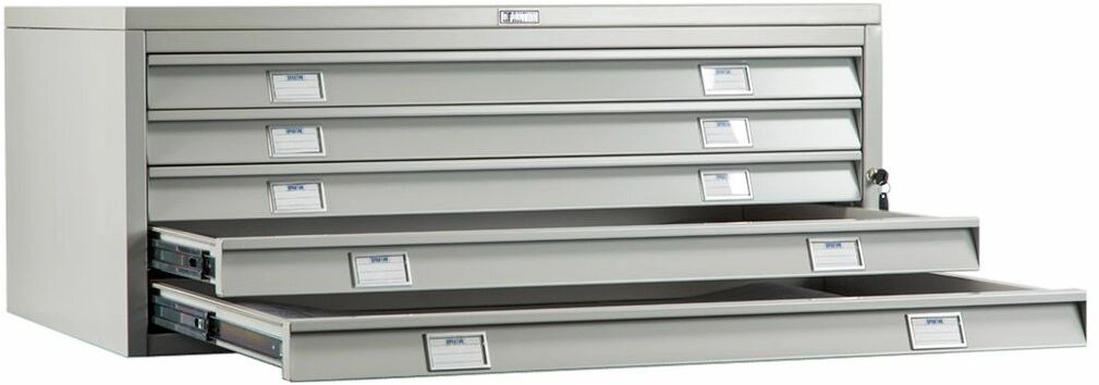 Предназначена для удобного хранения документов формата А1 (геологоразведочные карты, планы и конструкторские чертежи), дополнительно можно установить разделители под формат А2, А3, А4 (опция) телескопические направляющие обеспечивают свободный и плавный ход ящиков даже при полной загрузке система полного выдвижения ящиков нагрузка на ящик - 20 кг возможность установки промежуточной секции из 5 ящиков, увеличивающей емкость модуля до 15 ящиков центральный ключевой замок поставляются в собранном виде