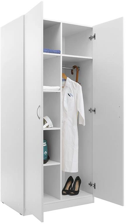 Шкаф предназначен для хранения рабочей и личной одежды и вещей в больницах, родильных домах, лечебных стационарах и других помещениях Каркас шкафа выполнен из ЛДСП толщиной 16 мм с кромкой 0,4 мм и соединяются эксцентриковыми стяжками, что обеспечивает высокую жесткость конструкции Задняя стенка состоит из двух частей, выполнена из ламинированного ХДФ 3мм Фасады шкафов выполнены из ЛДСП толщиной 16мм, на торцевые поверхности нанесена кромка ПВХ 0.4мм Эргономичные металлические ручки дверей Двери с углом открывания 110 градусов, плавный и бесшумный ход. Петли прошли испытание, не менее 80 000 циклов открываний Полки толщиной 16 мм, полкодержатели мебельные обеспечивают повышенную надежность Нагрузка на полку 30 кг Комплектуется съемными и несъемными полками, вертикальной перегородкой и хромированной перекладиной для вешалок Шкафы установлены на металлический цоколь 70 мм или хромированные опоры с регулировкой высоты, Н 100 мм, диаметр 50 мм --> Поставляются в разобранном виде Скачать техническое задание в формате .PDF