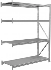 Предназначен для использования как на складах и производствах, так и в небольших помещениях – гаражи, торговые точки, кладовые Полочные стеллажи представляют собой, легко собираемую и разбираемую конструкцию, которая состоит из вертикальных рам, закрепленных на них горизонтальных балок и разборных полок Крепление балки к стойкам безболтовое. Балка крепится к стойке на зацепах и закрепляется фиксатором, предохраняющим балку от случайного подъема. Балки могут переставляться по высоте с шагом 50 мм Стойки изготовлены из оцинкованного металлического профиля 55х47мм Среднегрузовой стеллаж MS Pro 4 ярусa с металлическим настилом Нагрузка на секцию до 4000 кг, на ярус 500 кг