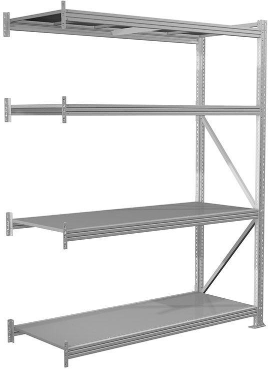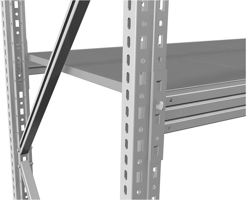 Предназначен для использования как на складах и производствах, так и в небольших помещениях – гаражи, торговые точки, кладовые Полочные стеллажи представляют собой, легко собираемую и разбираемую конструкцию, которая состоит из вертикальных рам, закрепленных на них горизонтальных балок и разборных полок Крепление балки к стойкам безболтовое. Балка крепится к стойке на зацепах и закрепляется фиксатором, предохраняющим балку от случайного подъема. Балки могут переставляться по высоте с шагом 50 мм Стойки изготовлены из оцинкованного металлического профиля 55х47мм Среднегрузовой стеллаж MS Pro 4 ярусa с металлическим настилом Нагрузка на секцию до 4000 кг, на ярус 450 кг