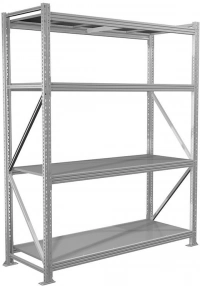 Предназначен для использования как на складах и производствах, так и в небольших помещениях – гаражи, торговые точки, кладовые Полочные стеллажи представляют собой, легко собираемую и разбираемую конструкцию, которая состоит из вертикальных рам, закрепленных на них горизонтальных балок и разборных полок Крепление балки к стойкам безболтовое. Балка крепится к стойке на зацепах и закрепляется фиксатором, предохраняющим балку от случайного подъема. Балки могут переставляться по высоте с шагом 50 мм Стойки изготовлены из оцинкованного металлического профиля 55х47мм Среднегрузовой стеллаж MS Pro 4 ярусa с металлическим настилом Нагрузка на секцию до 4000 кг, на ярус 450 кг
