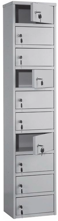 Предназначен для индивидуального хранения пломбиров, печатей и личных денег кассиров спроектированы согласно инструкции ЦБ № 318-П каждое отделение комплектуется ключевым замком предусмотрено крепление к стене поставляются в собранном виде