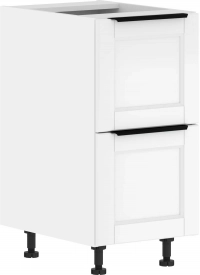 Каркас шкафа напольного из ЛДСП т.16 мм. Защита торцов: кромка ABS 0,45 мм., меламин. Наполнение - 2 больших ящика усиленной конструкции, с боковинами и дном из ЛДСП т.16 мм. Направляющие - шариковые (телескопические). Фасад из МДФ 19 мм, с фрезеровкой. Покрытие - высокостойкая полиуретановая эмаль. Ручка профильная металлическая, цвет - черный. Шкаф комплектуется регулируемыми опорами H=100 мм.