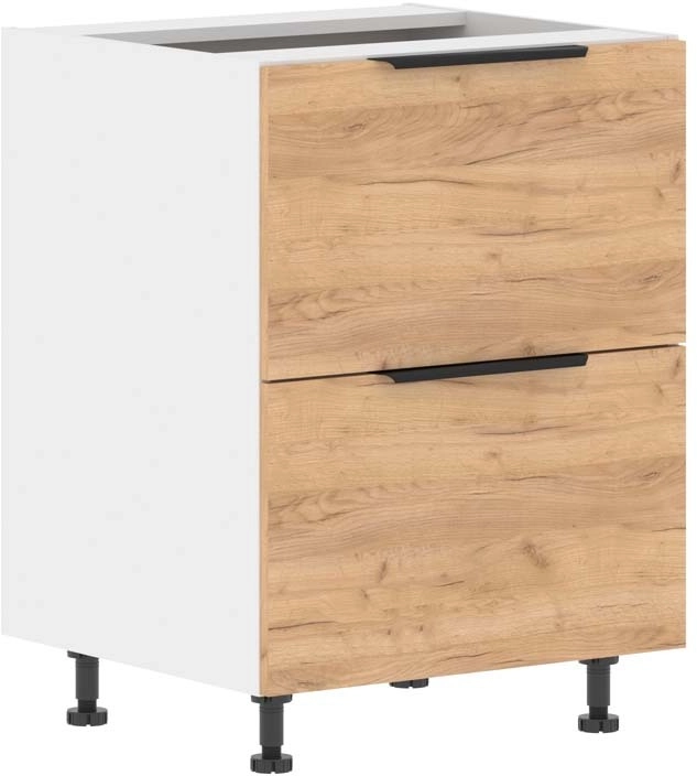 Каркас шкафа напольного из ЛДСП т.16 мм. Защита торцов каркасов, фасадов: кромка ABS 0,45 мм., меламин. Наполнение - 2 больших ящика усиленной конструкции, с боковинами и дном из ЛДСП т.16 мм. Направляющие - шариковые (телескопические). Фасады из ЛДСП т.18мм, ручка профильная металлическая, цвет - черный. Шкаф комплектуется регулируемыми опорами H=100мм