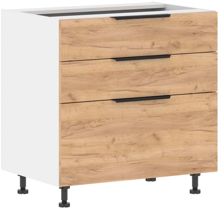 Каркас шкафа напольного из ЛДСП т.16 мм. Защита торцов каркасов, фасадов: кромка ABS 0,45 мм., меламин. Наполнение: 3 ящика - 2 малых и 1 большой, усиленной конструкции, с боковинами и дном из ЛДСП т.16 мм. Направляющие - шариковые (телескопические). Ручка профильная металлическая, цвет - черный. Шкаф комплектуется регулируемыми опорами H=100мм