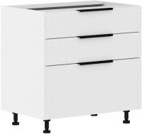 Каркас шкафа напольного из ЛДСП т.16 мм. Защита торцов: кромка ABS 0,45 мм., меламин. Наполнение: 3 ящика - 2 малых и 1 большой, усиленной конструкции, с боковинами и дном из ЛДСП т.16 мм. Направляющие - шариковые (телескопические). Фасад из МДФ 19 мм, с фрезеровкой по периметру. Покрытие - высокостойкая полиуретановая эмаль. Ручка профильная металлическая, цвет - черный. Шкаф комплектуется регулируемыми опорами H=100 мм.