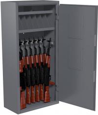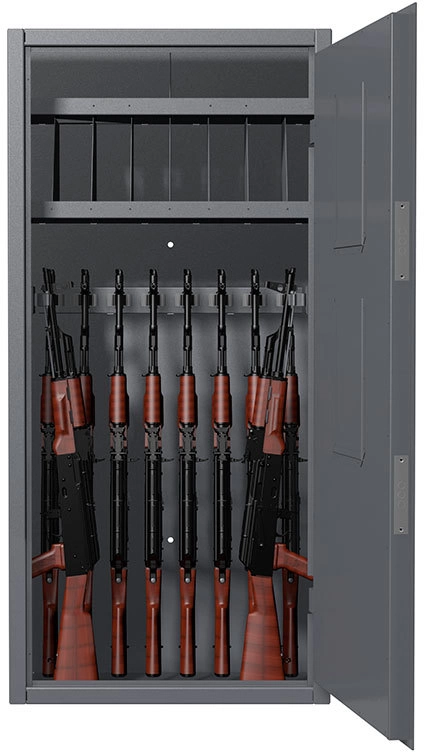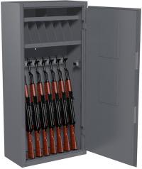 Предназначен для хранения 10 автоматов Калашникова различных модификаций. Шкаф сертифицирован. Класс устойчивости к взлому S2 по ГОСТ 55148-2012. Полностью соответствует требованиям МВД для хранения оружия Приказ №288 МВД РФ от 12.04.1999 г, Закону об оружии №150 ФЗ от 13.11.96г. , Постановлению правительства №814 от 21.07.1998 г. Сварной корпус, толщина стали 3 мм Комплектуются двумя ключевыми сувальдными замками класс 2 ГОСТ 5089-2011 (по 2 ключа от каждого замка в комплекте) с опечатывающими устройствами. На внутренней стороне двери размещены 2 рамки для описи формата А4. Конструкция полок обеспечивает гарантированно надежное и устойчивое положение за счет собственного веса оружия, а соответственно - долговечность эксплуатации Полка под магазины имеет 10 карманов под шильды, для идентификации оружия. Поставляется в собранном виде. *Дополнительные опции под заказ возможно разместить рамки под опись на внешней стороне двери возможно изменение внутреннего наполнения шкафа для различного сочетания оружия, боеприпасов и различных принадлежностей. дополнительные ключи