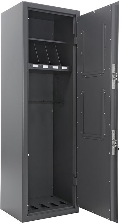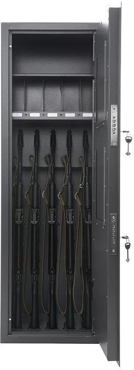 Предназначен для хранения 5 автоматов Калашникова различных модификаций Шкаф сертифицирован. Класс устойчивости к взлому S2 по ГОСТ 55148-2012 Полностью соответствует требованиям МВД для хранения оружия Приказ №288 МВД РФ от 12.04.1999 г, Закону об оружии №150 ФЗ от 13.11.96г. , Постановлению правительства №814 от 21.07.1998 г. Сварной корпус, толщина стали 3 мм Комплектуются двумя ключевыми сувальдными замками класс 2 ГОСТ 5089-2011 (по 2 ключа от каждого замка в комплекте) с опечатывающими устройствами На внутренней стороне двери размещены 2 рамки для описи формата А4 Конструкция полок обеспечивает гарантированно надежное и устойчивое положение за счет собственного веса оружия. Обеспечивает долговечность эксплуатации за счет отсутствия обжимных роликов Полка под магазины имеет 5 карманов под шильды, для идентификации оружия Поставляется в собранном виде Дополнительные опции под заказ возможно разместить рамки под опись на внешней стороне двери возможно изменение внутреннего наполнения шкафа для различного сочетания оружия, боеприпасов и различных принадлежностей дополнительные ключи