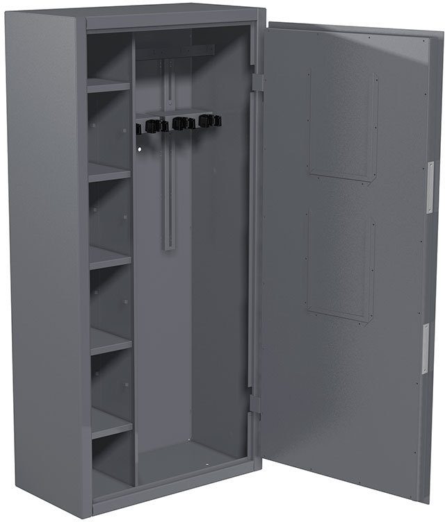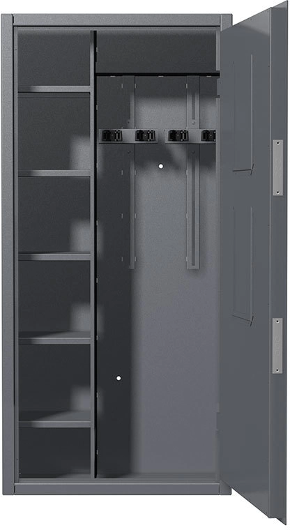Предназначен для хранения 4 винтовок с оптическим прицелом или пулеметов и боеприпасов к ним. Шкаф сертифицирован. Класс устойчивости к взлому S2 по ГОСТ 55148-2012 Полностью соответствует требованиям МВД для хранения оружия Приказ №288 МВД РФ от 12.04.1999 г, Законом об оружии 150 ФЗ от 13.11.96г. , Постановлению правительства №814 от 21.07.1998 г. Сварной корпус, толщина стали 3 мм Внутренние петли. Пассивные противовзломные ригеля Комплектуются двумя ключевыми сувальдными замками класс 2 ГОСТ 5089-2011 (по 2 ключа от каждого замка в комплекте) с опечатывающими устройствами. На внутренних сторонах дверей размещены 2 рамки для описи формата А4 Оборудован двумя подвижными планками. На каждой два резиновых ложемента «Valberg». Полки для боеприпасов и амуниции На планках имеются карманы под шильды для маркировки Анкерные отверстия для крепления шкафа к полу и к стене Поставляется в собранном виде Дополнительные опции под заказ возможно разместить две рамки под опись на внешней стороне двери возможно изменение внутренней компоновки по желанию заказчика дополнительные ключи