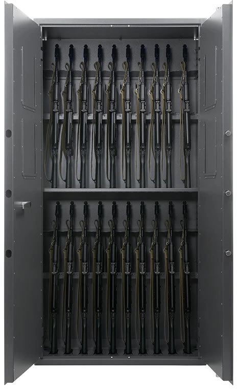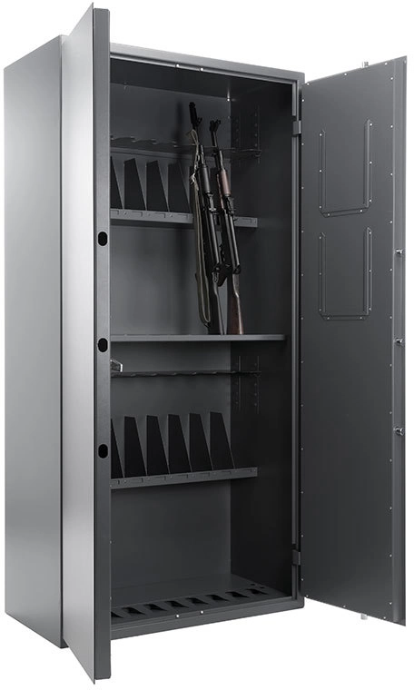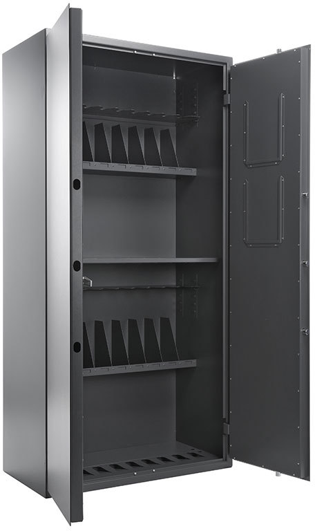 Предназначен для хранения различных модификаций автомата Калашникова. Предназначен для хранения 20 автоматов Калашникова различных модификаций Шкаф сертифицирован. Класс устойчивости к взлому S2 по ГОСТ 55148-2012 Полностью соответствует требованиям МВД для хранения оружия Приказ №288 МВД РФ от 12.04.1999 г, Законом об оружии 150 ФЗ от 13.11.96г. , Постановлению правительства №814 от 21.07.1998 г. Сварной корпус, толщина стали 3 мм 3-сторонняя ригельная система запирания. Внутренние петли. Пассивные противовзломные ригеля Комплектуются двумя ключевыми сувальдными замками класс 2 ГОСТ 5089-2011 (по 2 ключа от каждого замка в комплекте) с опечатывающими устройствами. Поворотная ручка для удобства открывания и закрывания. Левая створка двери оборудована двумя подпружиненными самозапирающимися защелками (вверх и вниз) с приводом от ручки находящейся на внутренней стороне створки двери На внутренних сторонах дверей размещены 4 рамки для описи формата А4 Конструкция полок обеспечивает гарантированно надежное и устойчивое положение за счет собственного веса оружия. Обеспечивает долговечность эксплуатации за счет отсутствия всякого рода китайских обжимных роликов Центральная полка имеет 20 карманов под шильды для маркировки (Два ряда по 10 карманов. Верхний для автоматов вверху и нижний для автоматов внизу) Анкерные отверстия для крепления шкафа к полу и к стене Поставляется в собранном виде *Дополнительные опции под заказ возможно оснастить шкаф подставкой с четырьмя неповоротными чугунными колесами (допускаемая нагрузка на колесо 200 кг.) и четырьмя регулируемыми винтовыми опорами. Подставка имеет два проема для перемещения шкафа подъемными устройствами возможно разместить две рамки под опись на внешней стороне двери возможно оснастить дополнительными полками для хранения противогазов, магазинов, штык-ножей, подствольных гранатометов и т.д. дополнительные ключи