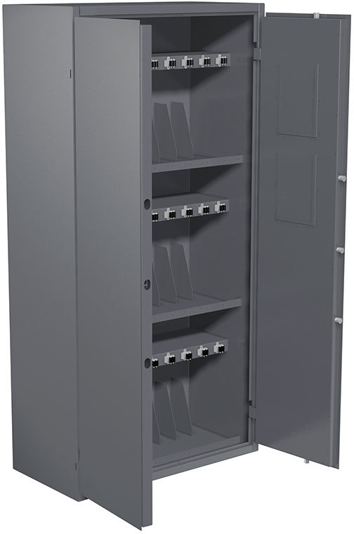 Предназначен для хранения 30 автоматов Калашникова АКС74У Шкаф сертифицирован. Класс устойчивости к взлому S2 по ГОСТ 55148-2012. Полностью соответствует требованиям МВД для хранения оружия Приказ №288 МВД РФ от 12.04.1999 г, Законом об оружии 150 ФЗ от 13.11.96г. , Постановлению правительства №814 от 21.07.1998 г. Сварной корпус, толщина стали 3 мм. 3-сторонняя ригельная система запирания. Внутренние петли. Пассивные противовзломные ригеля. Комплектуются двумя ключевыми сувальдными замками класс 2 ГОСТ 5089-2011 (по 2 ключа от каждого замка в комплекте) с опечатывающими устройствами. Поворотная ручка для удобства открывания и закрывания. Левая створка двери оборудована двумя подпружиненными самозапирающимися защелками (вверх и вниз) с приводом от ручки находящейся на внутренней стороне створки двери. На внутренних сторонах дверей размещены 4 рамки для описи формата А4. Конструкция полок обеспечивает гарантированно надежное и устойчивое положение за счет собственного веса оружия. Обеспечивает долговечность эксплуатации за счет отсутствия всякого рода китайских обжимных роликов. Опорные полки оборудованы карманами под шильды. Анкерные отверстия для крепления шкафа к полу и к стене. Анкерные болты в комплекте. Поставляется в собранном виде. Дополнительные опции под заказ возможно оснастить шкаф подставкой с четырьмя неповоротными чугунными колесами (допускаемая нагрузка на колесо 200 кг.) и четырьмя регулируемыми винтовыми опорами. Подставка имеет два проема для перемещения шкафа подъемными устройствами. возможно разместить две рамки под опись на внешней стороне двери Возможно увеличение количества автоматов до 40 шт. при изменении компоновки. возможно изменить количество хранимого оружия в различных сочетаниях и пропорциях. Дополнительные ключи