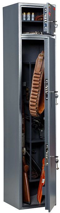 Предназначен для хранения огнестрельного оружия. Сейфы соответствуют требованиям ст.59 Постановления правительства РФ № 814 от 21 июля 1998 года «О мерах по регулированию гражданского и служебного оружия и патронов к нему на территории РФ». толщина металла корпуса и двери – до 2 мм оборудован патронным отделением, запирающимся на ключ, полками и ложементами для ружей комплектуется двумя ключевыми замками максимальная высота ствола 1222 мм наличие анкерных отверстий для крепления сейфа к стене