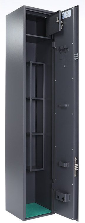 Предназначен для хранения огнестрельного оружия. Сейфы соответствуют требованиям ст.59 Постановления правительства РФ № 814 от 21 июля 1998 года «О мерах по регулированию гражданского и служебного оружия и патронов к нему на территории РФ». толщина металла корпуса и двери – до 2 мм оборудован патронным отделением, запирающимся на ключ, полками и ложементами для ружей комплектуется кодовым электронным замком PLS-3.2 (Промет) + ключевым замком максимальная высота ствола 1406 мм наличие анкерных отверстий для крепления сейфа к стене