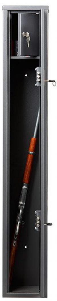 Предназначен для хранения огнестрельного оружия. Сейфы соответствуют требованиям ст.59 Постановления правительства РФ №814 от 21 июля 1998 года «О мерах по регулированию гражданского и служебного оружия и патронов к нему на территории РФ». максимальная высота ствола - 1278 мм конструкция патронного отделения позволяет размещать оружие, задействуя всю высоту сейфа комплектуются двумя ключевыми замками наличие анкерных отверстий для крепления сейфа к стене
