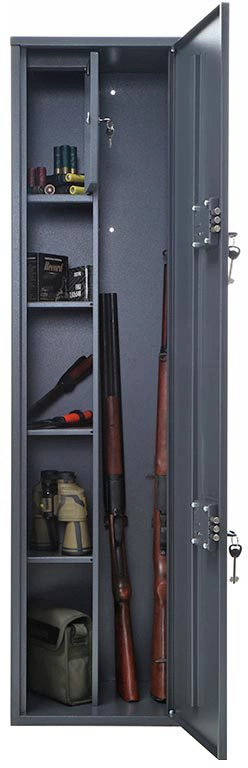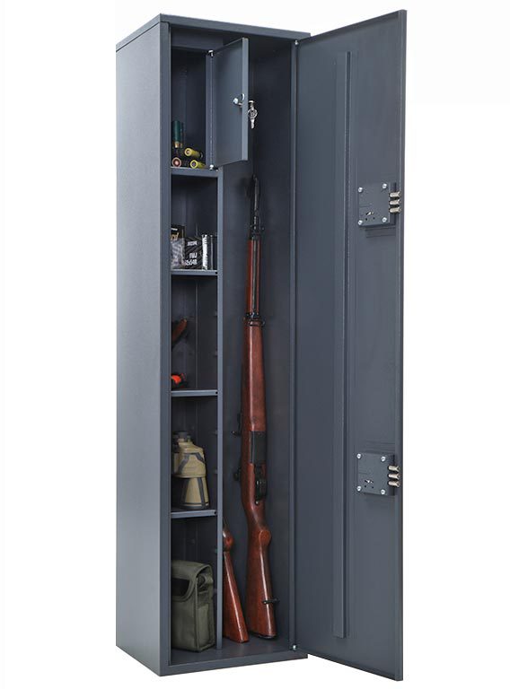 Предназначен для хранения огнестрельного оружия. Сейфы соответствуют требованиям ст.59 Постановления правительства РФ №814 от 21 июля 1998 года «О мерах по регулированию гражданского и служебного оружия и патронов к нему на территории РФ». толщина металла корпуса и двери – до 1 мм оборудован патронным отделением, запирающимся на ключ, три съемных полки с шагом регулировки 100 мм, ложементы не входят в базовую комплектацию и приобретаются отдельно. наличие анкерных отверстий для крепления сейфа к стене (анкерный болт в комплект не входит); * размер от дна до отделения под патроны-1075 мм * размер отделения отделения под ружья: ширина 178 мм, глубина 250 мм комплектуется двумя ключевыми трех-ригельными сувальдными замками;