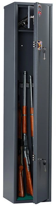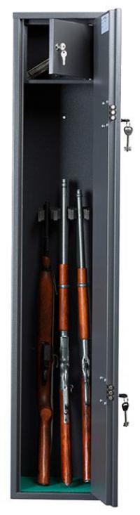 Предназначен для хранения огнестрельного оружия. Сейфы соответствуют требованиям ст.59 Постановления правительства РФ №814 от 21 июля 1998 года «О мерах по регулированию гражданского и служебного оружия и патронов к нему на территории РФ». максимальная высота ствола - 1484 мм оборудованы патронным отделением, запирающимся на ключ и ложементами для ружей комплектуются двумя ключевыми замками наличие анкерных отверстий для крепления сейфа к стене оборудованы патронным отделением, запирающимся на ключ и ложементами для ружей конструкция патронного отделения позволяет размещать оружие, задействуя всю высоту сейфа * линейный размер от поверхности дна до патронного отделения