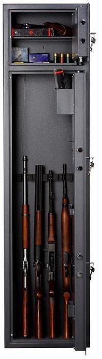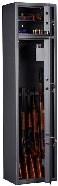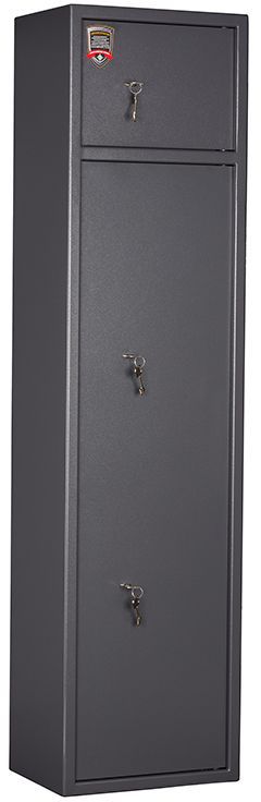 Предназначен для хранения огнестрельного оружия. Сейфы соответствуют требованиям ст.59 Постановления правительства РФ № 814 от 21 июля 1998 года «О мерах по регулированию гражданского и служебного оружия и патронов к нему на территории РФ». максимальная высота ствола - 1380 мм Комплектуются двумя ключевыми замками Толщина металла корпуса и двери – 3 мм Оборудованы патронным отделением, запирающимся на ключ, полками и ложементами для ружей. наличие анкерных отверстий для крепления сейфа к стене