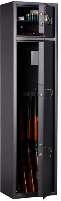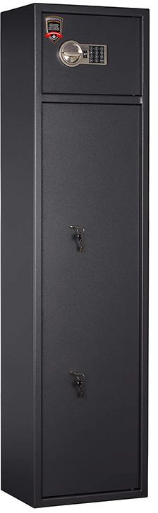 Предназначен для хранения огнестрельного оружия. Сейфы соответствуют требованиям ст.59 Постановления правительства РФ № 814 от 21 июля 1998 года «О мерах по регулированию гражданского и служебного оружия и патронов к нему на территории РФ». максимальная высота ствола - 1380 мм Комплектуются электронным кодовым замком PS-310/E01 + ключевой Толщина металла корпуса и двери – 3 мм оборудованы патронным отделением, запирающимся на ключ, полками и ложементами для ружей наличие анкерных отверстий для крепления сейфа к стене