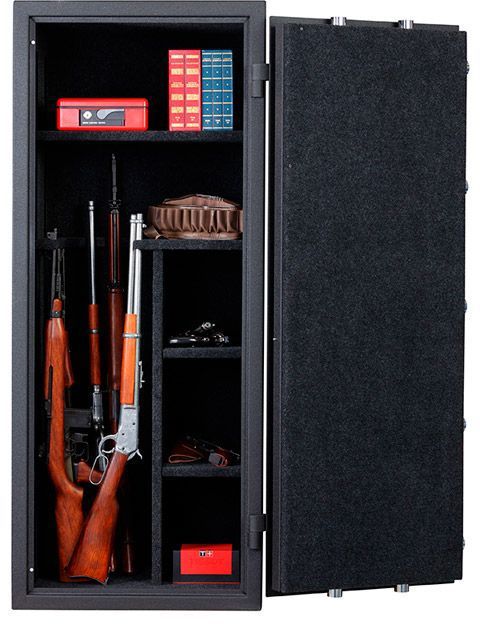 Предназначен для хранения огнестрельного оружия и патронов к нему. Сейфы соответствуют требованиям ст.59 Постановления правительства РФ № 814 от 21 июля 1998 года «О мерах по регулированию гражданского и служебного оружия и патронов к нему на территории РФ» и приказом МВД РФ №308 от 14.07.2003. Устойчивость к взлому соответствует классу оружейных сейфов А1 в соответствии с требованиями ГОСТ Р 56367-2015. максимальная высота ствола - 1410 мм комплектуется электронным замком PS600/E36 5-и лучевой штурвал 3-х сторонняя ригельная система запирания, диаметр ригелей 38мм защита замка и ригелей от высверливания и выбивания толщина двери 80 мм предусмотрена возможность анкерного крепления к полу максимальное количество ложементов: 12 стволов ОТДЕЛКА: внешняя отделка - черный муар внутренняя отделка – карпет (искусственное изностойкое покрытие) Под заказ возможно: замена карпета на эко-кожу или алькантару изменение внешнего покрытия на исполнение «GOLD» (лаковое покрытие с широкой цветовой палитрой)