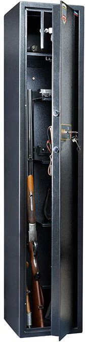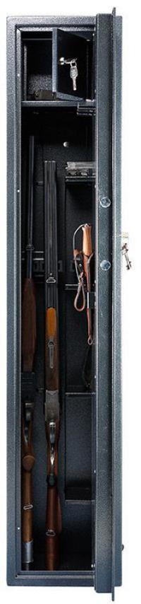 Предназначен для хранения огнестрельного оружия и патронов к нему. Сейфы соответствуют требованиям ст.59 Постановления правительства РФ № 814 от 21 июля 1998 года «О мерах по регулированию гражданского и служебного оружия и патронов к нему на территории РФ». Соответствуют Классу А.1 оружейных сейфов в соответствии с требованиями ГОСТ Р 56367-2015. толщина металла корпуса – 3 мм; толщина металла двери – 5 мм 3-х сторонняя ригельная система запирания (диаметр ригеля 18 мм) оборудованы патронным отделением (трейзер), запирающимся на ключ (соответствующий 3 классу по ГОСТ Р 5089-2003 или замок не ниже класса А по ГОСТ 51053-2012), полками и ложементами для ружей, ковриком комплектуются ключевым замком Kaba Mauer (класс А по ГОСТ Р 51053-2012) наличие анкерных отверстий для крепления сейфа к полу и стене максимальная высота ружья 1260мм