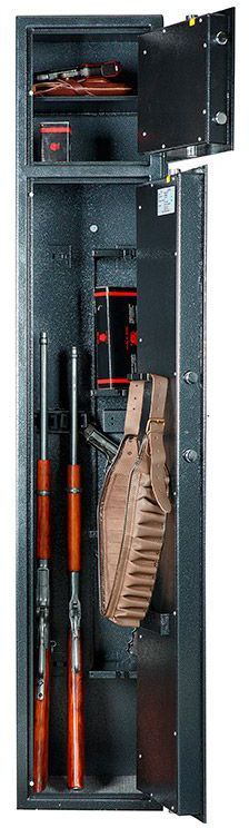 Предназначены для хранения огнестрельного оружия и патронов к нему. Сейфы соответствуют требованиям ст.59 Постановления правительства РФ № 814 от 21 июля 1998 года «О мерах по регулированию гражданского и служебного оружия и патронов к нему на территории РФ». Соответствуют Классу А.1 оружейных сейфов в соответствии с требованиями ГОСТ Р 56367-2015. толщина металла корпуса – 3 мм; толщина металла двери – 5 мм 3-х сторонняя ригельная система запирания (диаметр ригеля 18 мм) оборудованы патронным отделением (трейзер), запирающимся на ключ (соответствующий 3 классу по ГОСТ Р 5089-2003 или замок не ниже класса А по ГОСТ 51053-2012), полками и ложементами для ружей, ковриком комплектуются двумя ключевыми замками Kaba Mauer (класс А по ГОСТ Р 51053-2012) наличие анкерных отверстий для крепления сейфа к полу и стене максимальная высота ружья 1293 мм