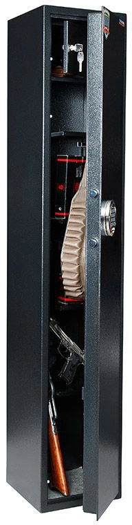 Предназначен для хранения огнестрельного оружия и патронов к нему. Сейфы соответствуют требованиям ст.59 Постановления правительства РФ № 814 от 21 июля 1998 года «О мерах по регулированию гражданского и служебного оружия и патронов к нему на территории РФ». Соответствуют Классу А.1 оружейных сейфов в соответствии с требованиями ГОСТ Р 56367-2015. толщина металла корпуса – 3 мм; толщина металла двери – 5 мм 3-х сторонняя ригельная система запирания (диаметр ригеля 18 мм) оборудованы патронным отделением (трейзер), запирающимся на ключ (соответствующий 3 классу по ГОСТ Р 5089-2003 или замок не ниже класса А по ГОСТ 51053-2012), полками и ложементами для ружей, ковриком комплектуются кодовым электронным замком PS 310/E31 (Промет) наличие анкерных отверстий для крепления сейфа к полу и стене максимальная высота ружья 1390 мм