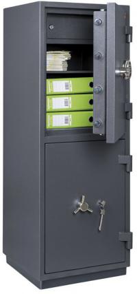 Предназначен для защиты документов и ценностей от несанкционированного доступа (взлома). Рекомендованная сумма хранения денег до 6.5 млн. руб. для физических лиц и до 2 млн. руб. для юридических лиц. Устойчивость к взлому по ГОСТ Р 50862-2017: класс 2 (ГОСТ Р). Oгнестойкость по ГОСТ Р 57384-2017: класс 30Б (ГОСТ Р). при заливке двери и корпуса сейфа используется специальный тяжелый бетон корпус сейфа и дверь заливные; толщина стенок - 40 мм 3-х сторонняя усиленная ригельная система запирания защита замка и ригелей от высверливания и выбивания система блокировки ригельного механизма при выбивании замка огнестойкость обеспечивают термоактивные прокладки комплектуются ключевым замком KABA MAUER (Германия) и электронным кодовым замком PS 610/E36 (ПРОМЕТ) наличие анкерного крепления к полу, анкерный болт в комплекте опция: дополнительные полки