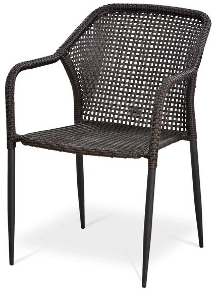 _x000D_ Плетеный стул с подлокотниками из искусственного ротанга коричневого цвета цвета. Имеет изящные ножки и необычное и стильное плетение спинки.