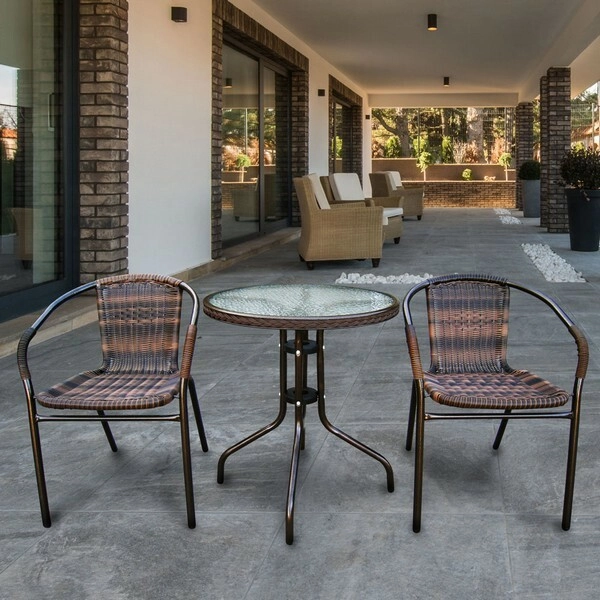 _x000D_ Стол: D60xH70 см. Стекло: закаленное- 5 мм. Труба: сталь D25 с полимерным покрытием. Столешница по периметру искусственный ротанг. Стул: W54хD58xH74 см. Каркас: труба сталь D25.Материал: искусственный ротанг. Цвет:орех(В) Объем и вес комплекта: 0,32м3,13,8кг.