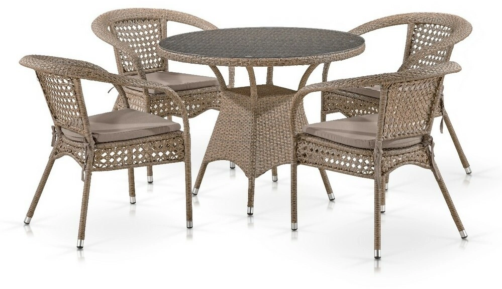 _x000D_ Стoл: D96хH74 см. Столешница: стекло закаленное-5мм, прозрачное. Кресло:: W60xD57xH78 см. (4 шт. ) Каркас: стальная труба D25.Материал: искусственный ротанг. Цвет: Light brown. Объем и вес комплекта: 1,0 куб. м, 42 кг.