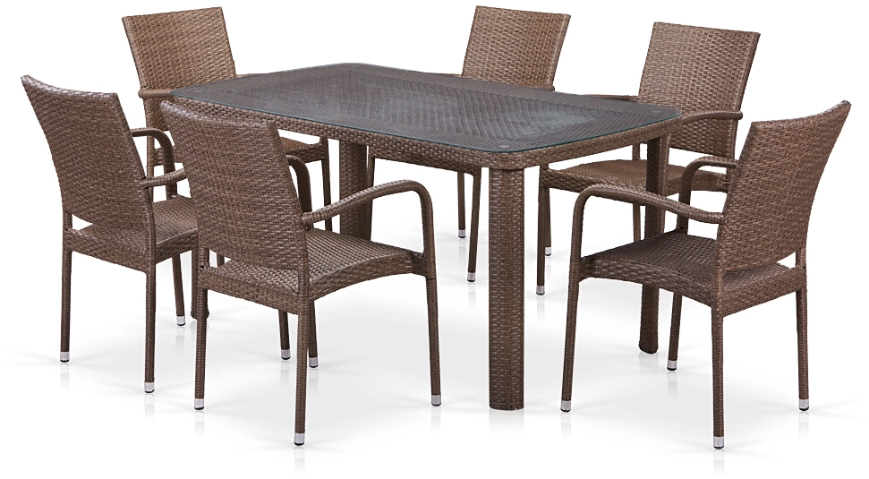 Стол: L150x85xH75 см, Стекло: закаленное - 5 мм, Стул: W54xD65xH88 см. (6 шт. ), Каркас: сталь, Материал: искусственный ротангЦвет: Brown, Объем и вес комплекта:, 0,9м3,55кг